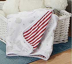 Jungle Gym 100% Cotton Interlock 2 ply Blanket. Warm and Cozy reverses from a collection coordinating allover Elephant Print to a contrast Red and White stripe. 30" x 40"